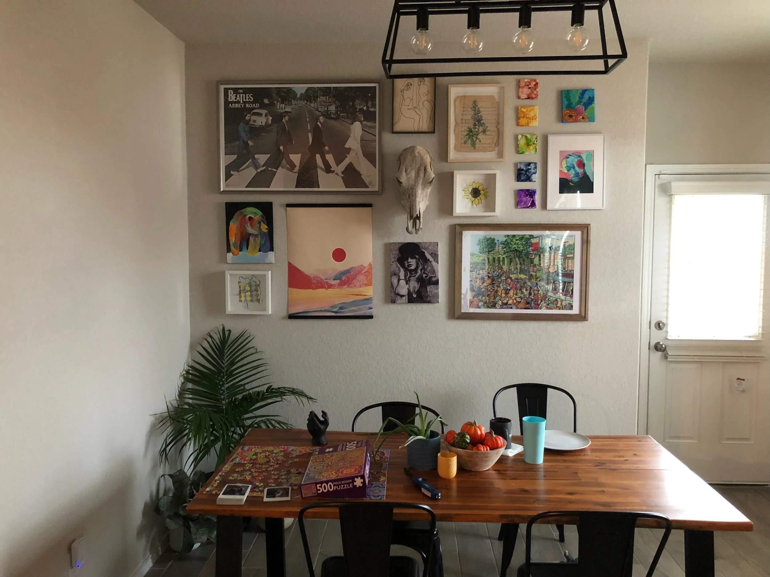 After several days of sponge-stamping, we stepped back and… weren’t totally in love. The wall felt too warm for our space.